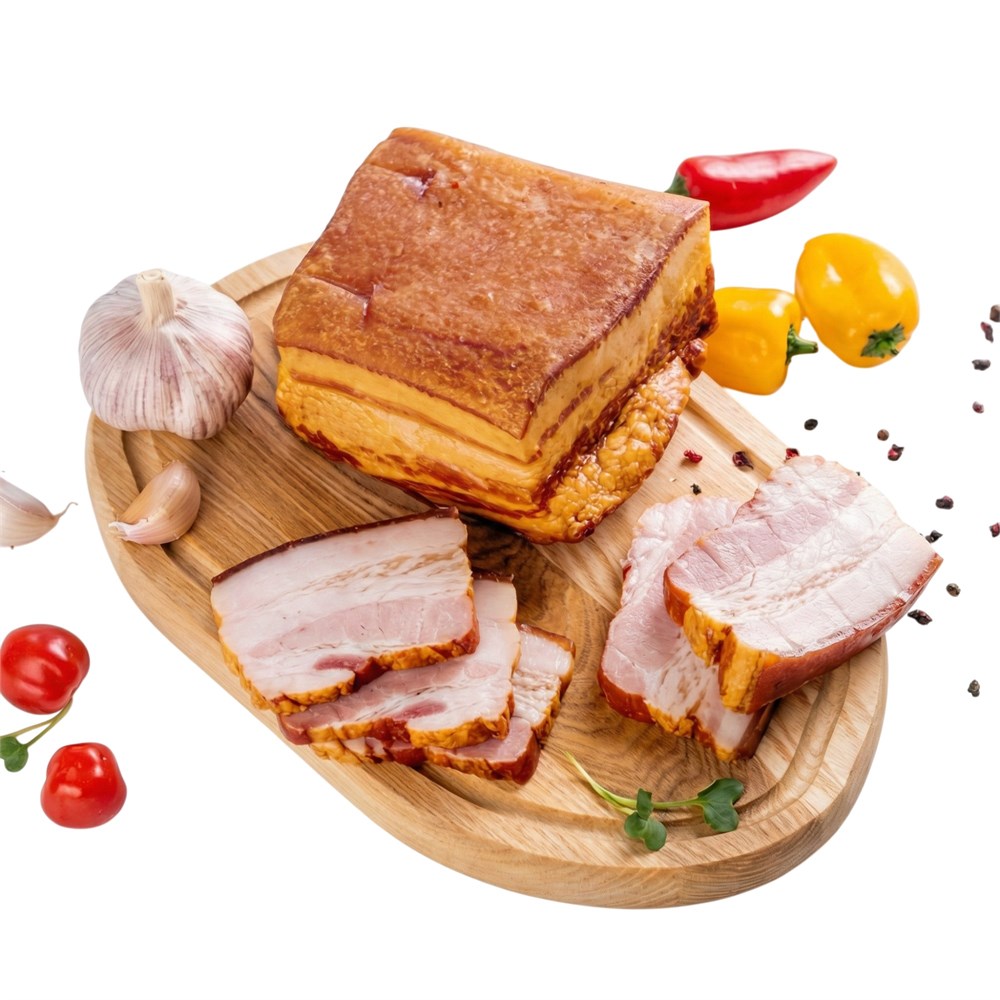 Состав: грудинка свиная, рассол (вода, соль, чеснок, загустители Е407, Е415, стабилизаторы Е450, Е301, перец, горчичное семя, экстракты специй, Е625, Е621)