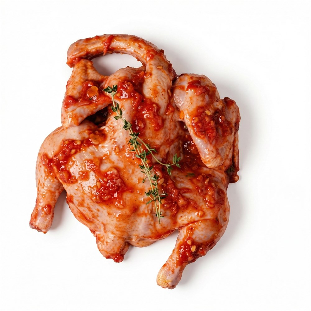 Состав: тушка цыпленка-бройлера, вода питьевая, чеснок свежий, соль, перец черный, паприка, куркума, горчица, сельдерей