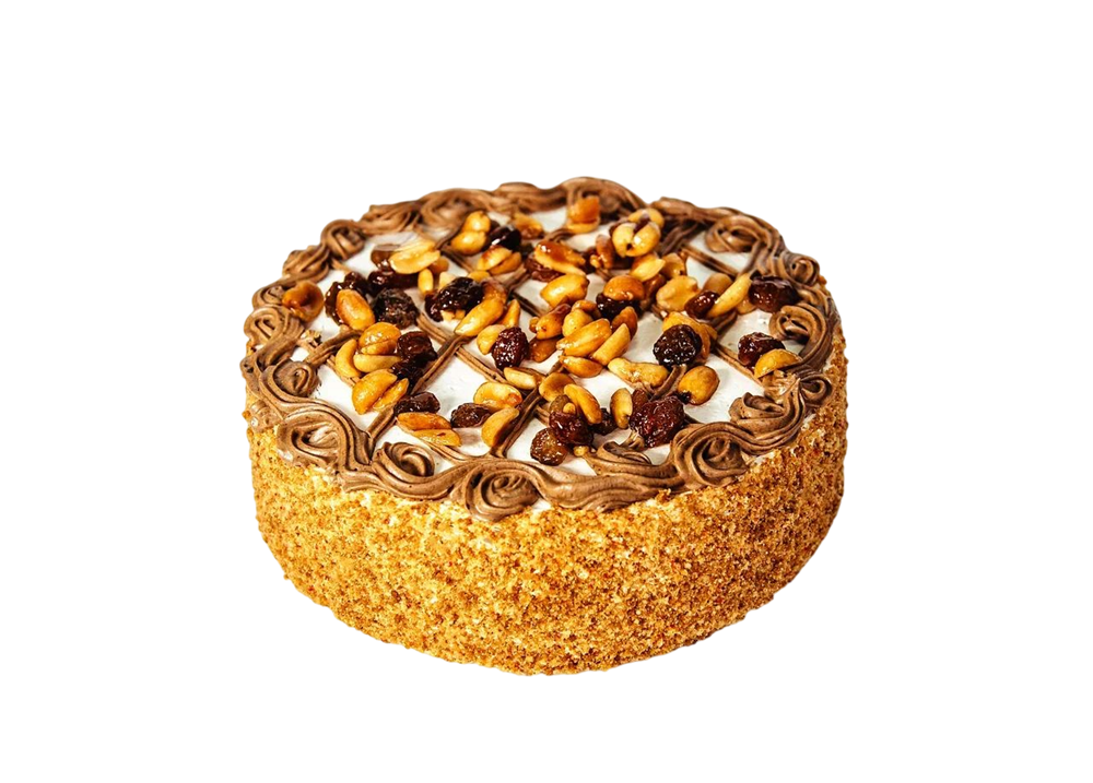 Классический бисквит, сливочный крем с вареным сгущенным молоком, абрикосовый конфитюр, изюм, арахис